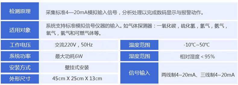 JD-GD可燃?xì)怏w檢測(cè)報(bào)警器(可燃?xì)怏w報(bào)警控制器)是本公司研制的一款可以同時(shí)處理多組4—20mA信號(hào)類型的儀器。它具有穩(wěn)定性好,準(zhǔn)確度高和參數(shù)智能化設(shè)置的特點(diǎn),外接控制端口豐富,用戶可以自由選擇掛接傳感器的種類和接入端口,并通過(guò)簡(jiǎn)單設(shè)置即可進(jìn)行現(xiàn)場(chǎng)檢測(cè)與報(bào)警。系統(tǒng)主要應(yīng)用于需要檢測(cè)可燃?xì)怏w的場(chǎng)合中,顯示待檢氣體的數(shù)值指標(biāo)量,當(dāng)現(xiàn)場(chǎng)的某種待檢氣體的指標(biāo)不符合所設(shè)置的標(biāo)準(zhǔn)時(shí),系統(tǒng)會(huì)自動(dòng)進(jìn)行一系列報(bào)警動(dòng)作,如報(bào)警,排風(fēng),跳閘等(根據(jù)用戶的不同設(shè)置而不同)。