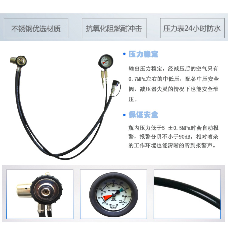 1.報(bào)警哨連同壓力表連接到使用者的胸前,這樣有利于使用者清楚地聽到報(bào)警聲,尤其適合多人同時(shí)在搶險(xiǎn)救援的作業(yè)現(xiàn)場,很容易辨別出呼吸器報(bào)警。