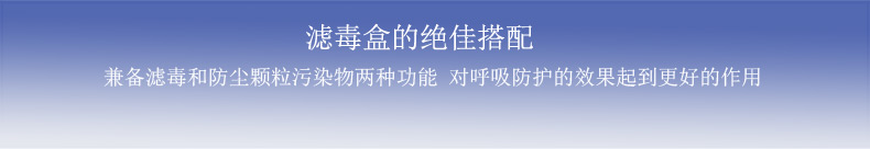 產品特點:搭配金盾濾毒盒使用,用于防護粉塵,煙,霧,微生物等顆粒污染物,過過濾95%以上的顆粒污染物。
